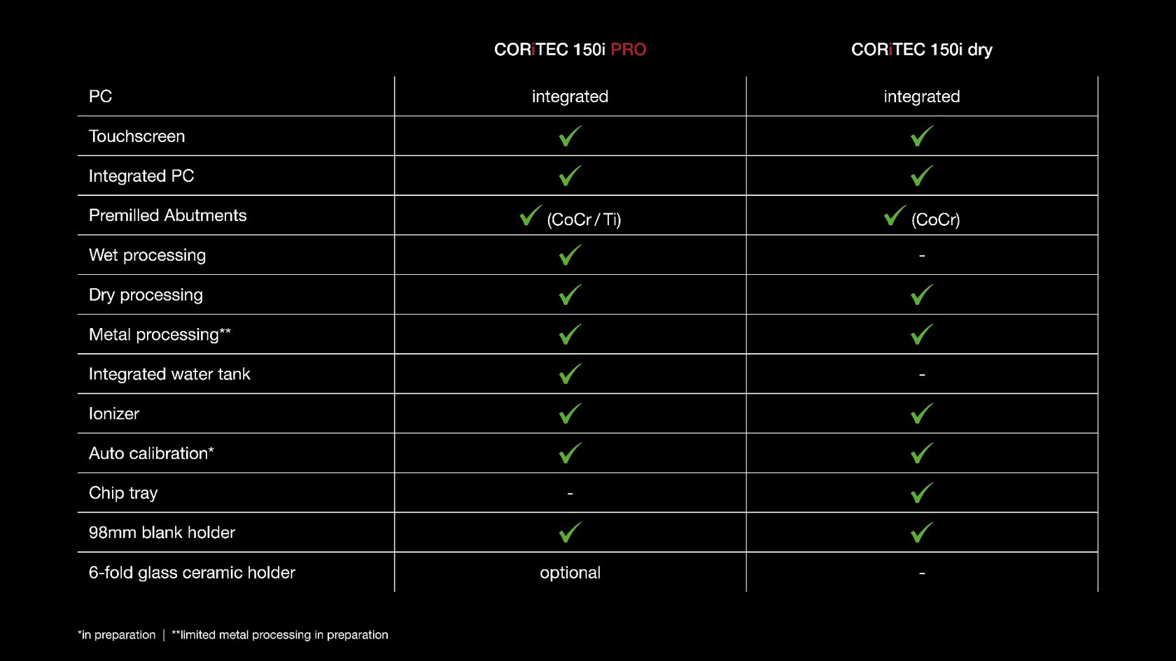 Каждая реставрация изготавливается с оптимальной точностью, и в то же время открывается почти свободный выбор материалов и показаний. Возможны фрезерование и шлифовка циркония, пластика и металла **, а также обработка дисков и блоков CAD / CAM и предварительно фрезерованных Pre-mill абатментов. CORiTEC 150i предлагает непревзойденное разнообразие применений в очень небольшом пространстве.
